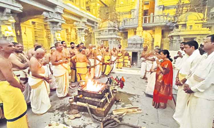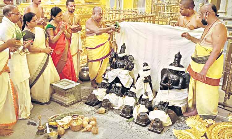 యాగశాలలో శాంతిపాఠం, ద్వారతోరణం, ధ్వజకుంభారాధనలు, చతుఃస్థానార్చన,