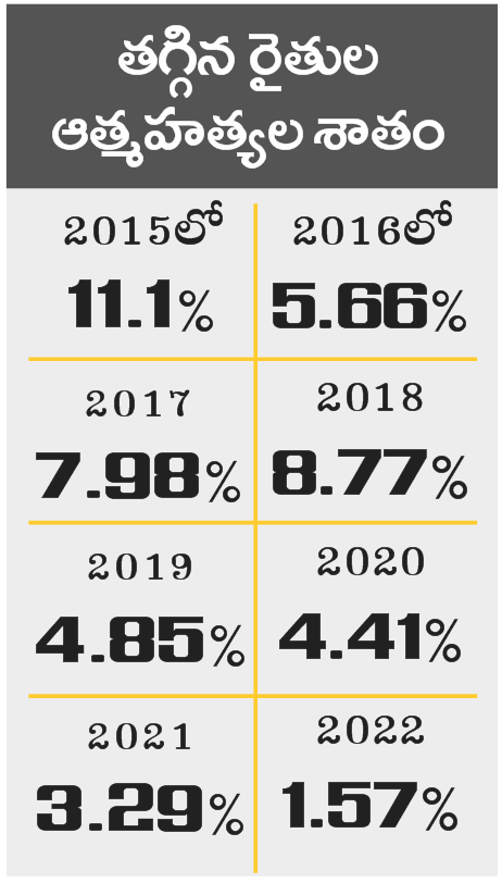 ‘ఉమ్మడి పాలనలో తెలంగాణ ప్రాంతం అత్యంత కరువు పీడిత ప్రాంతాల్లో ఒకటిగా నిలిచింది. ఉద్దేశపూర్వంగా గత పాలకులు నీటి వనరులను నిర్లక్ష్యంగా చేయడం మూలంగా తీవ్ర కరువుకాటకాలను అనుభవించింది. ఫలితంగా రైతులు పంటల సాగుకు అనేక ఇబ్బందులు పడ్డారు. సాగునీటి వనరులు లేక వ్యవసాయం గిట్టుబాటుగాక, అనేక మంది రైతులు ఆత్మహత్యలు చేసుకున్నారు. 2014 సంవత్సరానికి ముందు భారీ సంఖ్యలో రైతులు బలవన్మరణాలకు పాల్పడ్డారు.’ ‘2014 తర్వాత ప్రత్యేక తెలంగాణ రాష్ట్రం ఏర్పాటు కావడం, కేసీఆర్ నేతృత్వంలో బీఆర్ఎస్ ప్రభుత్వం కొలువుదీరడంతో పరిస్థితులు ఒక్కసారిగా కొలిక్కివచ్చాయి. కొత్త ప్రాజెక్టుల నిర్మాణం, చెరువుల పునరుద్ధరణతో సాగునీటి వసతులు మెరుగుపడ్డాయి. వ్యవసాయం పండుగలా మారింది. క్రమంగా రైతుల ఆత్మహత్యలు గణనీయంగా తగ్గాయి. కేసీఆర్ ప్రభుత్వం చేపట్టిన కార్యక్రమాలు, సమిష్టి ప్రయత్నాలు వ్యవసాయాన్ని సులభతరంగా మార్చాయి. రైతు జీవితాలు మెరుగుపడ్డాయి. ఇది కాదా.. మానవీయ ప్రభుత్వం అంటే’ అని కేటీఆర్ పేర్కొన్నారు. ఈ మేరకు ఆదివారం ట్వీట్ చేశారు. బీఆర్ఎస్ హయాంలో ఎనిమిదేండ్లలో రైతుల ఆత్మహత్యలు గణనీయంగా తగ్గినట్టు తెలిపారు. నేషనల్ క్రైమ్ రికార్డ్సు బ్యూరో విడుదల చేసిన గణాంకాల చార్ట్ను రీ ట్వీట్ చేశారు.