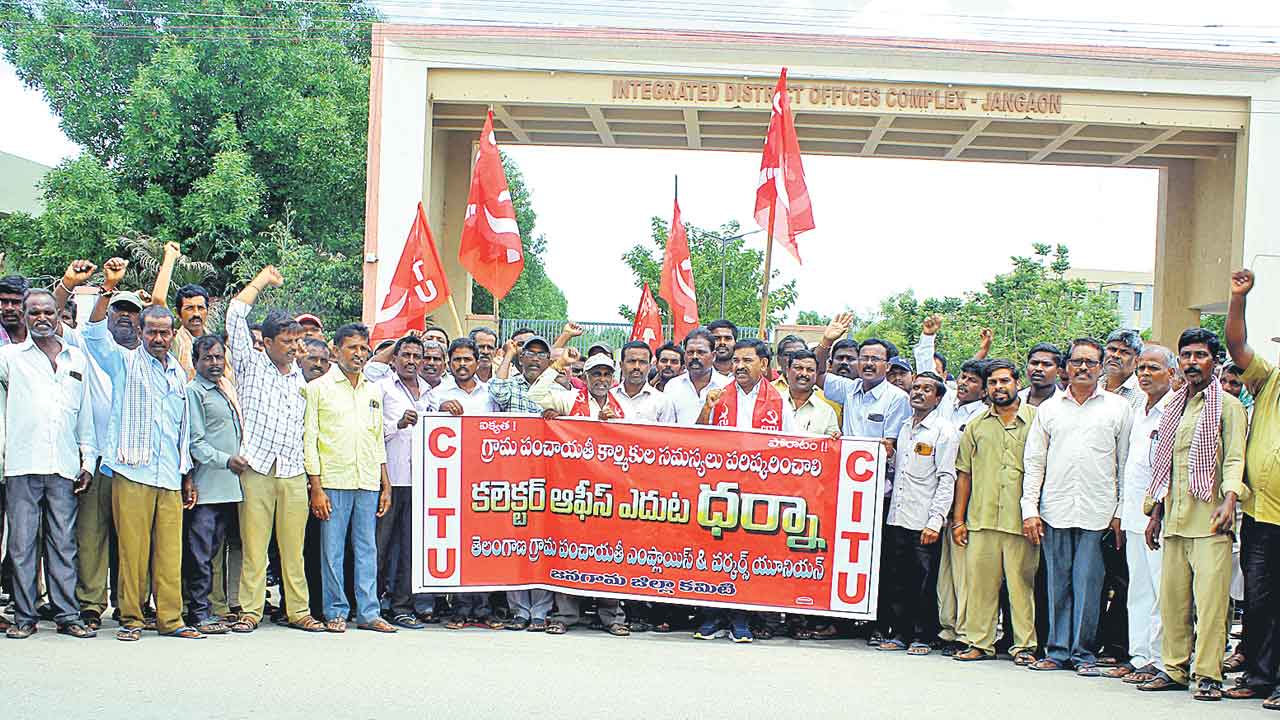 ఆరు నెలలుగా జీతాలు చెల్లించకుంటే ఎట్లా బతికేదని గ్రామపంచాయతీ కార్మికులు ప్రశ్నిస్తున్నారు. వేతన బకాయిలు చెల్లించాలని డిమాండ్ చేస్తూ బుధవారం జనగామ కలెక్టరేట్ ఎదుట సీఐటీయూ ఆధ్వర్యంలో ధర్నా నిర్వహించారు. రైల్వే స్టేషన్ నుంచి కలెక్టరేట్ ర్యాలీ నిర్వహించారు. అనంతరం తమ సమస్యలను పరిషరించాలని కోరుతూ కార్యాలయంలో వినతిపత్రం అందజేశారు.