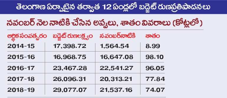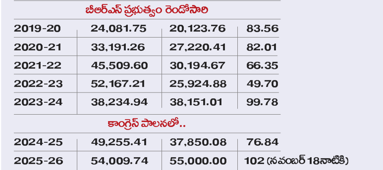 రాష్ట్రం ఏర్పడిన తొలి ఏడాది 2014-15లో బడ్జెట్లో రుణ ప్రతిపాదన రూ.17,398.72 కోట్లు ఉండగా, నాటి ప్రభుత్వం నవంబర్ నాటికి రూ.1,564.54కోట్లు మాత్రమే సమీకరించింది. 2025-26 బడ్జెట్లో గతంలో ఎన్నడూలేనంతగా రూ.54,009.74 కోట్లు ప్రతిపాదించింది. నవంబర్ 18నాటికే రూ.55,000 సేకరిస్తున్నది. అంటే రుణ సమీకరణ లక్ష్యం 102 శాతానికి పెరిగింది. గడిచిన పదేండ్లలో రెండేండ్లు 2019-20, 2020-21 కొవిడ్ మహమ్మారి విజృంభించి ఆర్థికలావాదేవీలు స్పందించినా, రాష్ట్ర ప్రభుత్వానికి రుపాయి ఆదాయం రాకపోయినా నాడు రుణ సమీకరణ లక్ష్యాన్ని పెంచుకోలేదు. బడ్జెట్ ప్రతిపాదించిన మొత్తంలో గరిష్ఠంగా 83.56 శాతమే నాటి కేసీఆర్ సర్కారు సమీకరించింది.