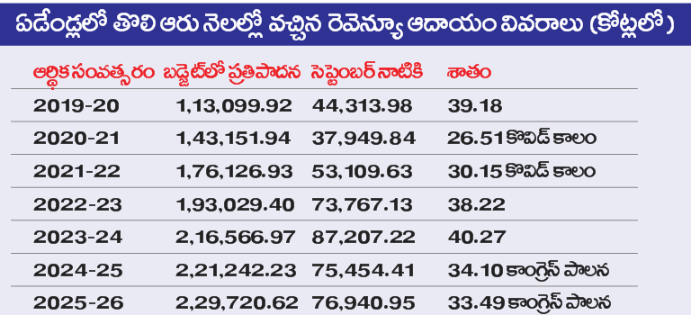 హైడ్రా, ఫ్యూచర్ సిటీ, మెట్రో రద్దు వంటి నిర్ణయాలతో రియల్ ఎస్టేట్ వ్యాపారం తగ్గిపోయింది. స్టాంప్స్ అండ్ రిజిస్ట్రేషన్ ఫీజులు, సేల్స్ ట్యాక్సులు వంటివి తగ్గాయి. 2024-25 ఆర్థిక సంవత్సరంలో తొలి ఆరు నెలల్లో రెవెన్యూ ఆదాయం 34.10 శాతం రాగా, ఈ ఆర్థిక సంవత్సరంలో అదే కాలానికి 33.49 శాతమే వచ్చింది. కొవిడ్ కాలం మినహా గడిచిన 11 ఏండ్లలో ఇంత తక్కువ శాతం ఆదాయం రాలేదు. ఒకవైపు రాష్ట్ర ఆదాయం పెరుగకపోవడం, మరోవైపు తెలంగాణపై రుణభారం గతంలో ఎన్నడూలేనంతా వేగంగా పెరిగిపోతుండటంపై ఆర్థిక నిపుణులు ఆందోళన వ్యక్తంచేస్తున్నారు. కాంగ్రెస్ పాలన ఇలాగే కొనసాగితే.. ఇప్పుడున్న సంక్షేమ పథకాల అమలుకు, అభివృద్ధి పనులకు ఆర్థికకష్టాలు తప్పవని హెచ్చరిస్తున్నారు.