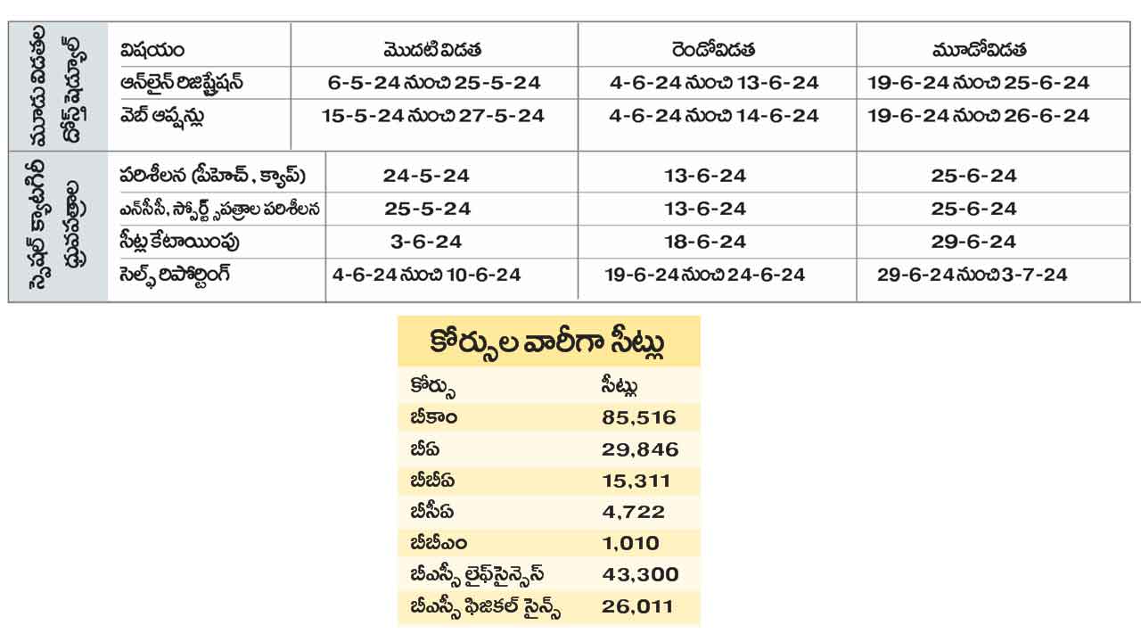 ఈ ఏడాది డిగ్రీలో నాలుగు కొత్త కోర్సులను ప్రవేశపెడుతున్నారు. 14 కాలేజీల్లో బీకాం ఫైనాన్స్, మరికొన్ని కాలేజీల్లో బీఏ (స్పెషల్) హెచ్ఈపీ, బీఎస్సీ బయోమెడికల్ సైన్స్, బీఏ పబ్లిక్పాలసీ అండ్ గవర్నెన్స్ కోర్సులను నిర్వహిస్తారు. 20 అటానమస్ కాలేజీల్లో బ్యాంకింగ్ అండ్ ఫైనాన్షియల్ అండ్ ఇన్సూరెన్స్ సర్వీసెస్ (బీఎఫ్ఎస్ఏ)ను ఎలక్టివ్గా ప్రవేశపెడుతున్నారు. బీఎఫ్ఎస్ఏ కోర్సులో 5వేల మంది ఇంజినీరింగ్, మరో 5వేల మంది నాన్ ఇంజినీరింగ్ కోర్సుల వారికి అడ్మిషన్లు కల్పిస్తారు. రాష్ట్రవ్యాప్తంగా 1,066 డిగ్రీ కాలేజీలుండగా, వీటిల్లో 4,49,449 సీట్లున్నాయి.