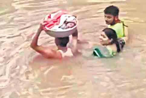 పెద్దపల్లి, జూలై 14(నమస్తే తెలంగాణ)/మంథని : బాహుబలి సినిమాలో రమ్యకృష్ణ బాలుడిని ఒంటి చేత్తో పైకి లేపి వరదలో నుంచి వెళ్లే సీన్ గురువారం పెద్దపల్లి జిల్లా మంథనిలోని మర్రివాడలో ఆవిష్కృతమైంది. బొక్కలవాగు వరద తీ వ్రం కావడంతో మర్రివాడ ముంపునకు గురైంది. ఈ కాలనీ కి చెందిన పుప్పాల సుమలత-సుధాకర్తోపాటు 3 నెలల బాలుడు అక్కడే చిక్కుకుపోయారు. పుప్పాల రాము అనే యువకుడు బాలుడిని గంపలో పెట్టుకొని నెత్తిన ఎత్తుకొని సురక్షిత ప్రాంతానికి తీసుకెళ్లాడు. ఈ చిత్రాన్ని పలువురు తమ సెల్ఫోన్లలో చిత్రీకరించగా సోషల్ మీడియా లో ‘బాహుబలి సీన్’ అంటూ చక్కర్లు కొడుతున్నది.