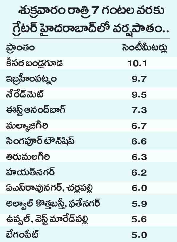 హైదరాబాద్/హైదరాబాద్ సిటీబ్యూరో, జూలై 29 (నమస్తే తెలంగాణ): ఉత్తర-దక్షిణ ద్రోణి, ఉపరితల ఆవర్తనం ప్రభావంతో శుక్రవారం గ్రేటర్ హైదరాబాద్లోని పలు ప్రాంతాల్లో వాన దంచికొట్టింది. ఉదయం నుంచి ఎండ వచ్చినప్పటికీ మధ్యాహ్నం 3 గంటల తర్వాత వాతావరణం ఒక్కసారిగా మారిపోయింది. దాదాపు 2 గంటలపాటు ఏకధాటిగా కురిసిన కుంభవృష్టితో హైదరాబాద్ అతలాకుతలమైంది. రోడ్లన్నీ జలమయమాయ్యయి. పలుచోట్ల వాహనాల రాకపోకలకు తీవ్ర అంతరాయం ఏర్పడింది. లోతట్టు ప్రాంతాల్లోని ఇండ్లలోకి నీరు చేరింది. కీసర, ఇబ్రహీంపట్నం, దండుమైలారం, నేరేడ్మెట్, మల్కాజిగిరి, ఈస్ట్ ఆనంద్బాగ్, సింగపూర్ టౌన్షిప్ తదితర ప్రాంతాల్లో భారీ వర్షం కురిసింది. సాయంత్రం 6 వరకు కీసర మండ లం బండ్లగూడలో అత్యధికంగా 10.1, ఇబ్రహీంపట్నంలో 9.7 సెంటీమీటర్ల వర్షపాతం నమోదైనట్టు టీఎస్డీపీఎస్ అధికారులు తెలిపారు.