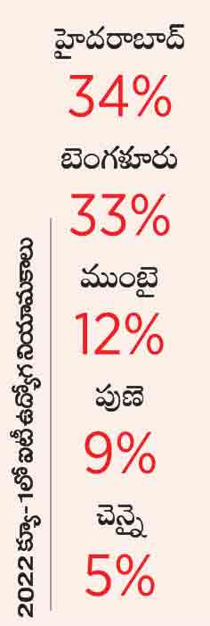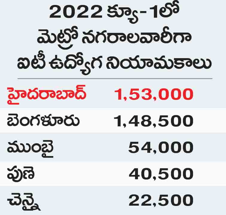 హైదరాబాద్ సిటీబ్యూరో, ఆగస్టు 2 (నమస్తే తెలంగాణ): ఐటీ ఉద్యోగాల కల్పనలో హైదరాబాద్ మరోసారి సత్తా చాటింది. ప్రస్తుత ఆర్థిక సంవత్సర (2022-23) తొలి త్రైమాసికం (క్యూ-1)లో అత్యధిక ఐటీ ఉద్యోగాలు కల్పించి దేశంలోనే అగ్రస్థానంలో నిలిచింది. దేశంలోని మెట్రో నగరాల్లో ఈ ఏడాది ఏప్రిల్-జూన్ మధ్య కాలంలో కొత్తగా 4.5 లక్షల మందికి ఐటీ ఉద్యోగాలు లభించాయని, ఇందులో అత్యధికంగా 1,53,000 నియామకాల (34% వాటా)తో హైదరాబాద్ ప్రథమ స్థానంలో నిలిచిందని ‘క్వెస్ ఐటీ స్టాఫింగ్’ తాజా నివేదికలో ప్రకటించింది. ఈ జాబితాలో హైదరాబాద్ తర్వాత బెంగళూరు (1,48,500), ముంబై (54,000), పుణె (40,500), చెన్నై (22,500) ఉన్నట్టు వెల్లడించింది.