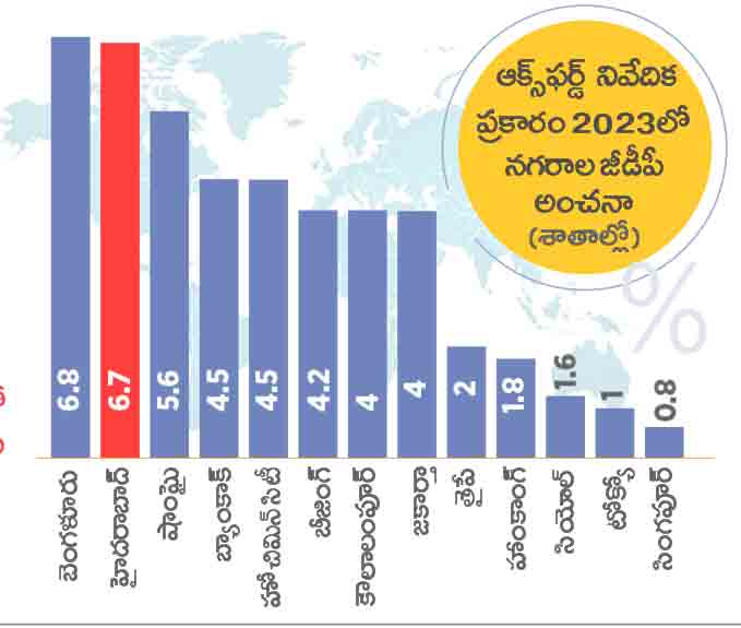 ఆర్థికంగా కొమ్ములు తిరిగిన నగరాలు కూడా మాంద్యం దెబ్బకు కుదేలవుతుండగా, హైదరాబాద్ మాత్రం తగ్గేదే లే అంటున్నది. ఆక్స్ఫర్డ్ ఎకనామిక్స్ ఆసియా పసిఫిక్ రీజినల్ అవుట్లుక్ నివేదిక ప్రకారం హైదరాబాద్ నగరం 2023లో 6 శాతానికిపైగా వృద్ధిరేటు నమోదుచేయనున్నది. బెంగళూరు కూడా ఇంచుమించు ఇదే స్థాయిలో వృద్ధి నమోదు చేయనున్నది. చైనా నగరాలు కొవిడ్-19తో విలవిలలాడుతున్న దరిమిలా 2023లో అవి ఆర్థికంగా కోలుకొనే పరిస్థితులు చాలా తక్కువగా ఉన్నట్టు వెల్లడించింది. బ్యాంకాక్ నగరం పర్యాటక రంగంలో కొంతమేర కోలుకొనే అవకాశమున్నదని తెలిపింది.