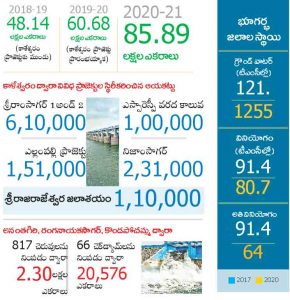 18,82,970 ఎకరాల ఆయకట్టును స్థిరీకరించడమేకాకుండా.. కొత్తగా 18,25,700 ఎకరాల కొత్త ఆయకట్టుతో మొత్తంగా 37,08,670 ఎకరాలకు సాగునీరిచ్చే కల్పవల్లి కాళేశ్వరం ప్రాజెక్టు. మూడు మహా బరాజ్ల నుంచి 22 ప్రాంతాల్లో లిఫ్టులు ఎత్తిపోసిన జలాలు.. 15 రిజర్వాయర్లు నింపుతూ తెలంగాణలో మొత్తం 1,832 కిలోమీటర్ల ప్రయాణంలో ప్రతి జలవనరుకూ నీటిని అందిస్తూ పోయే కాళేశ్వర గంగ.. రెండు పంటలకు భరోసానివ్వటమే కాకుండా.. భూగర్భంలో జలాల కాఠిన్యాన్ని తగ్గించి.. పాతాళాన్ని సైతం జలబాంఢాగారంగా మార్చుతూ.. పుడమిపై జీవవైవిధ్యానికి