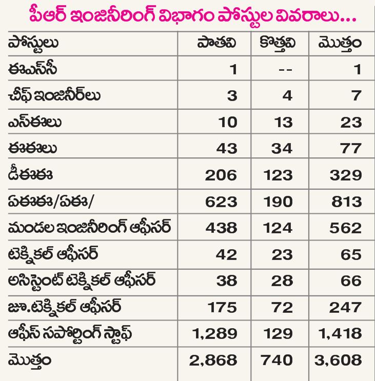 పంచాయతీరాజ్ విభాగంలో ప్రభుత్వం ఇంజినీరింగ్ విభాగాన్ని పునర్వ్యవస్థీకరించింది. క్షేత్రస్థాయిలో వాస్తవ పనులకు అనుగుణంగా అధికారులు, సిబ్బంది ఉండే విధంగా కొత్త పోస్టులను సృష్టిస్తూ సీఎం కేసీఆర్ నిర్ణయం తీసుకున్నారు. పీఆర్ ఇంజినీరింగ్ అధికారులకు పరిపాలనపరమైన అనుమతుల ఇచ్చే అధికారాన్ని ఇచ్చారు. దీంతో పీఆర్ ఇంజినీరింగ్ విభాగంలో కొత్తగా 740 పోస్టులు రానున్నాయి. తెలంగాణలో 33 జిల్లాలు ఏర్పాటు చేయడంతో పంచాయతీరాజ్ రోడ్ల పర్యవేక్షణకు ఎస్ఈ, క్వాలిటీ కంట్రోల్ విభాగాలకు కార్యాలయాలు, అధికారులను ఏర్పాటు చేసేందుకు కొత్త భవనాలు, పోస్టులు వచ్చాయి. జిల్లాల్లో రోడ్లను, ఇతర పీఆర్ పనులను పర్యవేక్షించడానికి సీఈలను ఏర్పాటుచేశారు. పీఆర్ రోడ్ల కిలోమీటర్లు పెరిగినా గతంలో ఉన్న సిబ్బంది, అధికారులే ఉన్నారు. దీంతో జిల్లాలు, మండలాలకు అనుగుణంగా పీఆర్ ఇంజినీరింగ్ విభాగాన్ని పునర్వ్యవస్థీకరించారు. కొత్తగా మంజూరైన పోస్టుల్లో క్వాలిటి కంట్రోల్ విభాగాలను ఏర్పాటు చేశారు.