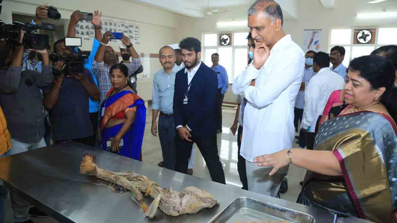 సిద్దిపేట: వైద్య విద్యార్థుల కోసం అన్ని రకాల సదుపాయాల కోసం కృషి చేస్తున్నామని రాష్ట్ర ఆర్ధిక, వైద్య ఆరోగ్యశాఖ మంత్రి హరీశ్ రావు అన్నారు. సిద్దిపేట ప్రభుత్వ మెడికల్ కాలేజీలో నిర్వహించిన మెడ్ఎక్స్పో కార్యక్రమంలో మంత్రి హరీశ్ రావు పాల్గొన్నారు. విద్యార్థులు ప్రదర్శించిన ప్రదర్శనను తిలకించారు. అనంతరం ఆయన మాట్లాడుతూ.. గతంలో వైద్యవిద్య కోసం ఉక్రెయిన్, రష్యాకు వెళ్లి చదువుకునే వారని చెప్పారు. ఇప్పుడు పరిస్థితి పూర్తిగా మారిందని, రాష్ట్రంలో జిల్లాకో మెడికల్ కాలేజి ఏర్పాటు చేసుకుంటున్నామని తెలిపారు.
