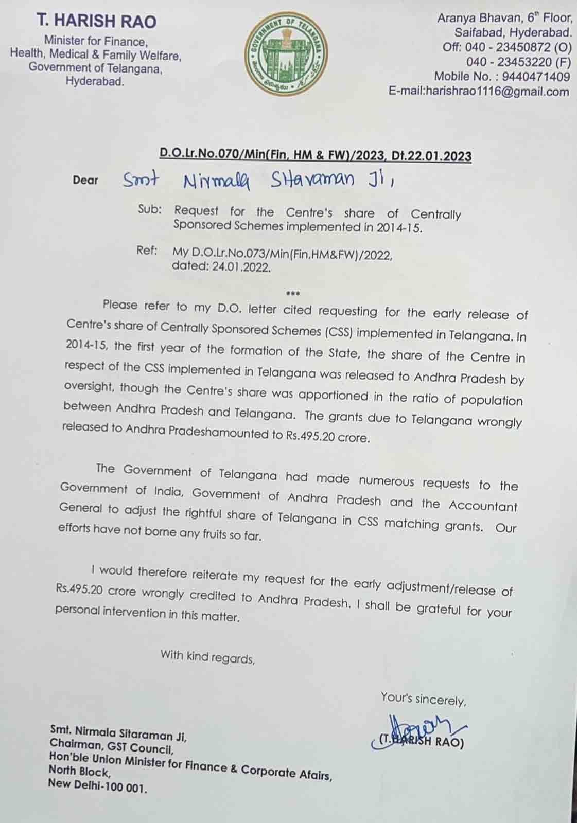 రాష్ట్ర విభజన జరిగిన తర్వాత మొదటి సంవత్సరంలో (2014-15) కేంద్రం నుంచి వచ్చే నిధులను ఆంధ్రప్రదేశ్, తెలంగాణ మధ్య జనాభా ప్రాతిపదికన విభజించారని, అయినా, పొరపాటున మొత్తం సీఎస్ఎస్ నిధులను ఆంధ్రప్రదేశ్కు విడుదల చేశారని గుర్తుచేశారు. దీంతో తెలంగాణ నష్ట పోయిందని లేఖలో పేర్కొన్నారు. ఈ విషయాన్ని తాము ఇప్పటికే కేంద్ర, ఆంధ్రప్రదేశ్ ప్రభుత్వాలతోపాటు అకౌంటెంట్ జనరల్ దృష్టికి తీసుకువెళ్లామన్నారు. ఎనిమిదేండ్లు గడుస్తున్నా రూ.495 కోట్లను తెలంగాణకు ఇంకా సర్దుబాటు చేయలేదని పేర్కొన్నారు. ఇప్పటికైనా ఆ మొత్తాన్ని తిరిగి తెలంగాణకు విడుదల చేసేలా కృషి చేయాలని నిర్మలా సీతారామన్ను కోరారు. వ్యక్తిగతంగా శ్రద్ధ తీసుకొని తెలంగాణకు జరిగిన అన్యాయాన్ని సరిదిద్దాలని లేఖలో విన్నవించారు.