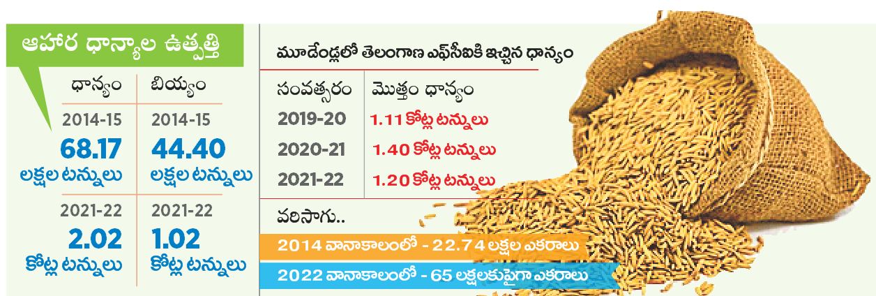 ఎనిమిదిన్నరేండ్లలో ప్రభుత్వం సేకరించిన ధాన్యం సుమారు 6.70 కోట్ల టన్నులు. దీని విలువ రూ.1.20 లక్షల కోట్లు. కేంద్ర వ్యవసాయశాఖ లెక్కల ప్రకారం తెలంగాణ వ్యవసాయ రంగంలోకి 2019 అక్టోబర్-2021 సెప్టెంబర్ మధ్య 49.44 బిలియన్ డాలర్ల విదేశీ పెట్టుబడులు వచ్చాయి.