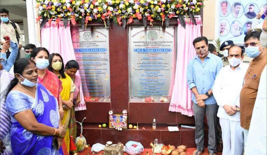 Ministers @KTRTRS and @mahmoodalitrs inaugurated 288 units of 2 BHK Dignity Houses at Pilligudiselu, Saidabad, Hyderabad. MP @asadowaisi, MLA Ahmed Bin Abdullah Balala, Mayor @GadwalvijayaTRS, Dy Mayor @SrilathaMothe, and other dignitaries participated. pic.twitter.com/HuEcQgmTnC