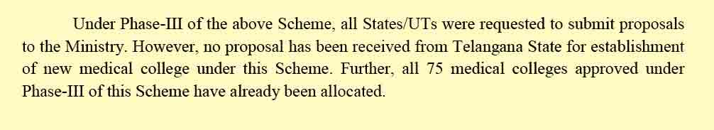 తెలంగాణలో సీఎస్ఎస్ కింద మెడికల్ కాలేజీల ఏర్పాటుపై కాంగ్రెస్ ఎంపీ ఉత్తమ్కుమార్రెడ్డి 2021, డిసెంబర్ 3న లోక్సభలో అడిగిన ప్రశ్నకు కేంద్రమంత్రి భారతీ ప్రవీణ్ పవార్ ఇచ్చిన సమాధానం