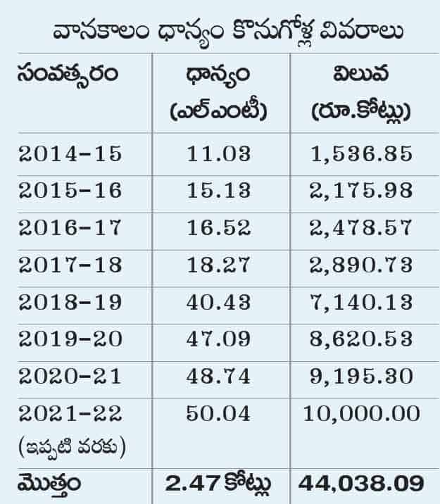 రాష్ట్రంలో ఈ వానకాలంలో 60 లక్షల టన్నుల ధా న్యం సేకరణకు కేంద్రం అంగీకరించింది. అయితే ఇప్పటికే రాష్ట్రప్రభుత్వం 50 లక్షల టన్నులు కొనుగోలుచేసింది. మరో 30-40 లక్షల టన్నులు వచ్చే అవకాశం ఉండటంతో మొత్తం 90 లక్షల టన్నుల ధాన్యం వచ్చే అవకాశం ఉన్నది. కేంద్ర ప్రభుత్వం మాత్రం 60 లక్షల టన్నులకే అంగీకరించింది. ఈ పరిస్థితిని అంచనావేసే సేకరణ పరిమితిని పెంచాలని సీఎం కేసీఆర్ స్వయం గా కేంద్ర మంత్రి పీయూష్ గోయల్ను కోరారు. ఇప్పటివరకూ దీనిపై కేంద్ర మంత్రి స్పందించనేలేదు. ఈ అంశాన్ని శుక్రవారం జరిగే సమావేశంలో సీఎం కేసీఆర్ దృష్టికి తీసుకెళ్తానని పౌర సరఫరాలశాఖ మంత్రి గంగుల కమలాకర్ తెలిపారు.