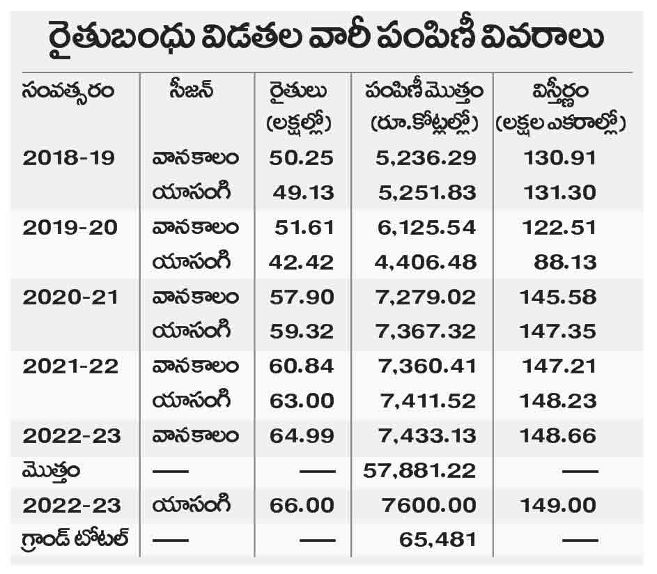 సంక్రాంతి వరకు అర్హులైన ప్రతి రైతు బ్యాంకు ఖాతాలో నిధులు జమ చేయనున్నారు. ఈ సీజన్లో సుమారు 66 లక్షల మంది రైతుల కోసం రూ.7,600 కోట్ల నిధులు అవసరమవుతాయని అధికారులు అంచనా వేస్తున్నారు. గత సీజన్ వరకు రైతుబంధు ద్వారా రూ.57,881 కోట్లను ప్రభుత్వం కర్షకుల ఖాతాల్లో జమ చేసింది. యాసంగి పంటసాయం కూడా అందితే ఇప్పటివరకు రైతులకు అందించిన రైతుబంధు నిధుల మొత్తం రూ.65వేల కోట్లు దాటుతుంది.