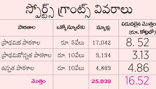 హైదరాబాద్, డిసెంబర్ 13 (నమస్తే తెలంగాణ) : రాష్ట్రంలోని 25,039 సర్కార్ బడులకు రూ.16.52 కోట్ల స్పోర్ట్స్ నిధులను పాఠశాల విద్యాశాఖ అధికారులు విడుదల చేశారు. క్రీడలను ప్రోత్సహించడంలో భాగంగా ఒక్కో ప్రాథమిక స్కూల్కు రూ.5వేలు, ప్రాథమికోన్నత, ఉన్నత పాఠశాలలకు రూ.10 వేల చొప్పున స్పోర్ట్స్ నిధులను రిలీజ్ చేశారు. ఈ నిధులతో క్రీడా పరికరాలను కోనుగోలు చేయాలని సూచించారు.