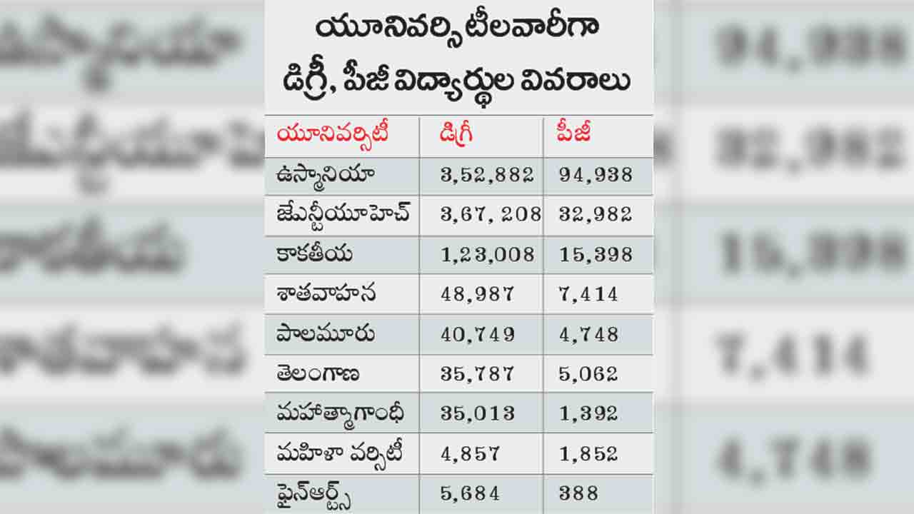 అంటే డిగ్రీ కోర్సుల్లోని మొత్తం విద్యార్థులతో పోల్చితే పీజీ కోర్సుల్లో చేరిన వారి శాతం కేవలం 18శాతమే. కన్వెన్షల్ వర్సిటీల్లో 10,20,796 మంది డిగ్రీ కోర్సుల్లో చేరితే, పీజీ కోర్సుల్లో చేరిన వారు 1,64,800 మంది మాత్రమే. ఇక స్పెషలైజ్డ్ వర్సిటీల్లో 2,02,649 మంది డిగ్రీ కోర్సుల్లో చేరితే పీజీ కోర్సుల్లో 20,048 మంది మాత్రమే ఉన్నారు. వాస్తవానికి వర్సిటీల్లో పీజీ కోర్సుల్లో చదవడమంటేనే గతంలో క్రేజీ ఉండేది. కానిప్పుడా క్రేజీ కనిపిండచంలేదు. ఏ యూనివర్సిటీ తీసుకున్నా.. ఏ స్పెషలైజేషన్ తీసుకున్నా ఇదే పరిస్థితి నెలకొన్నది.