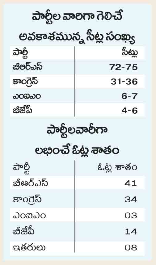 Telangana | హైదరాబాద్, నవంబర్ 1 (నమస్తే తెలంగాణ): అసెంబ్లీ ఎన్నికల్లో ప్రజలు మళ్లీ బీఆర్ఎస్కే పట్టం కట్టబోతున్నారు. అత్యధిక సీట్లు గెలుచుకొని గులాబీ పార్టీ ప్రభంజనం సృష్టించబోతున్నదని మరో సర్వే సంస్థ తేల్చి చెప్పింది. రాష్ట్రంలో త్వరలో జరిగే ఎన్నికల్లో ఏ పార్టీకి ఎన్ని సీట్లు వస్తాయి? గెలుపెవరది? అనే అంశంపై ‘జనతా కా మూడ్’ అనే జాతీయ సంస్థ రాష్ట్రవ్యాప్తంగా సెప్టెంబర్ 1 నుంచి అక్టోబర్ 20వ తేదీ వరకు సర్వే నిర్వహించింది.