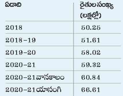 తెలంగాణ ప్రభుత్వం 2018లో రైతుబంధు, 2019లో రైతు బీమా పథకాలను తీసుకొచ్చింది. ఈ రెండు పథకాల ద్వారా ఇప్పటివరకు తెలంగాణ ప్రభుత్వం రూ.54,016 కోట్లు రైతన్నకు సాయంగా అందించింది. కేంద్ర ప్రభుత్వం దేశవ్యాప్తంగా అన్ని రాష్ర్టాల రైతులకు అందించిన సాయం రూ.1,09,114 కోట్లు. పైగా కేంద్ర ప్రభుత్వం చేసే సాయం ఒక్కో రైతు కుటుంబానికి ఏడాదికి గంపగుత్తగా మూడు విడతల్లో అందించే సాయం రూ.6 వేలు మాత్రమే. తెలంగాణ ప్రభుత్వం ఎంతమంది రైతులున్నా ఏడాదికి ఎకరానికి రూ.5 వేల చొప్పున రెండు విడతలుగా వానకాలం, యాసంగి సీజన్లకు అందిస్తున్నది. రైతుబంధు పథకం ప్రారంభించినప్పటికంటే.. రైతుల సంఖ్య దాదాపు పది లక్షలు పెరిగిందంటేనే తెలంగాణలో వ్యవసాయం వైపు ప్రజలు ఏ విధంగా మళ్లుతున్నారో.. ఎందుకు ఆసక్తి చూపుతున్నారో అర్థం చేసుకోవచ్చు.