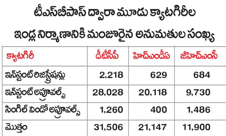 హైదరాబాద్, మార్చి 19 (నమస్తే తెలంగాణ): టీఎస్బీపాస్ ద్వారా పట్టణాల్లో ఇండ్ల నిర్మాణాలకు త్వరితగతిన అనుమతులు మంజూరు చేస్తున్నారు. ఇప్పటివరకు మొత్తం 64,553 ఇండ్ల నిర్మాణానికి అనుమతులు మంజూరుచేశారు. 12,213 దరఖాస్తులను తిరస్కరించారు. కొంతమంది దరఖాస్తుదారులు పత్రాలు పూర్తి స్థాయిలో సమర్పించకపోవడం లాంటి కారణాలతో వివిధ దశల్లో పెండింగ్లో ఉన్నాయి. దరఖాస్తు చేసుకొన్న 21 రోజుల తరువాత డీమ్డ్ అప్రూవల్గా అనుమతులు ఇస్తున్నారు. ఇలా 1,996 అనుమతులు ఇచ్చారు. టీఎస్బీపాస్ ద్వారా ఇండ్ల నిర్మాణాలకే కాకుండా లేఅవుట్స్కు కూడా అనుమతులు ఇస్తున్నారు. దీంతో కొనుగోలుదారులకు అపోహలు, అనుమానాలు తొలగిపోతున్నాయి. అనుమతుల మంజూరు ఎక్కడా జాప్యం జరగకుండా ప్రభుత్వం చర్యలు తీసుకొంటున్నది. ప్రజల ఫిర్యాదులపై అధికారులు తక్షణమే స్పందించే విధంగా చర్యలు చేపట్టారు. విచారణలో జాప్యానికి కారణమైన అధికారులపై క్రమశిక్షణా చర్యలు చేపడుతున్నారు. అనుమతుల మంజూరులో ఆలస్యం జరిగితే సంబంధిత ఉద్యోగుల వేతనాల్లో కోతలు విధిస్తున్నారు. ఫిర్యాదుల పరిషార వ్యవస్థను బలోపేతం చేయడంతో పాటు టోల్ఫ్రీ నంబర్కు మరింత ప్రచారం కల్పిస్తున్నారు. ఈ-మెయిల్ ద్వారా వచ్చే ఫిర్యాదులతో పాటు, సోషల్ మీడియా ద్వారా వచ్చే ఫిర్యాదులపై కూడా స్పందించనున్నారు. టీఎస్బీపాస్ ద్వారా ఇండ్లను మూడు క్యాటగిరీలుగా విభజించి అనమతులు మంజూరు చేస్తున్నారు.