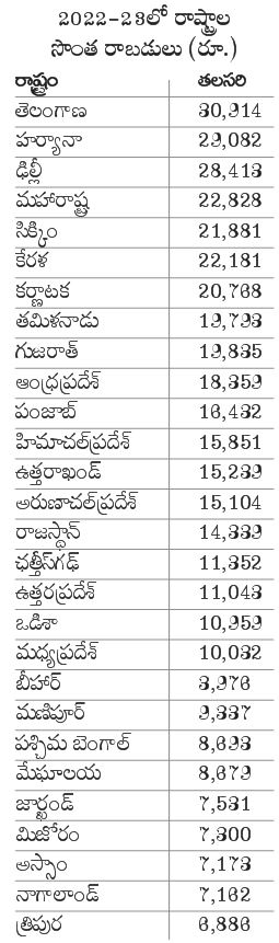 హైదరాబాద్, జనవరి 6 (నమస్తే తెలంగాణ): సొంత రాబడుల్లో తెలంగాణ మరోసారి సత్తా చాటింది. 2022-23 ఆర్థిక సంవత్సరంలో అత్యధికంగా రూ.30,914 తలసరి సొంత రాబడితో దేశంలోనే అగ్రస్థానంలో నిలిచింది. ఉద్యమ నేత కేసీఆర్ నేతృత్వంలోని గత బీఆర్ఎస్ ప్రభుత్వం చేపట్టిన సంస్కరణలతోనే ఇది సాధ్యమైంది.