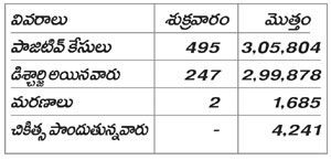 హైదరాబాద్, మార్చి 27 (నమస్తే తెలంగాణ): రాష్ట్రంలో కరోనా మహమ్మారి వేగంగా విస్తరిస్తున్నది. శుక్రవారం 58,029 వైరస్ నిర్ధారణ పరీక్షలు నిర్వహించగా, 495 మందికి పాజిటివ్గా తేలినట్టు శనివారం విడుదలచేసిన బులెటిన్లో వైద్యారోగ్యశాఖ స్పష్టంచేసింది. అత్యధికంగా జీహెచ్ఎంసీలో 142, మేడ్చల్ మల్కాజిగిరి జిల్లాలో 45, రంగారెడ్డిలో 35, నిజామాబాద్లో 30, నల్లగొండలో 21, సంగారెడ్డిలో 20, మహబూబ్నగర్లో 18, కరీంనగర్లో 16, ఖమ్మంలో 15 కేసులు వెలుగుచూశాయి.