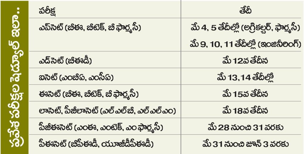 ఆ వెంటనే మే 15న ఈసెట్ పరీక్ష ఉంటుంది. మే 18న లాసెట్, పీజీలాసెట్ పరీక్షలు ఉండగా, పీజీఈసెట్ పరీక్షలు మే 28 నుంచి 31 వరకు నిర్వహిస్తారు. బీపీఈడీ, యూజీడీపీఈడీ కోర్సుల్లో ప్రవేశాలకు నిర్వహించే పీఈసెట్కు ఎలాంటి పరీక్షలు ఉండవు. కొన్ని ఫిజికల్ ఈవెంట్స్ నిర్వహించి, ఆయా మార్కుల ఆధారంగా ర్యాంకులు కేటాయిస్తారు. ఇవి మే 31 నుంచి జూన్ 3 వరకు జరుగుతాయి. వీలైనంత త్వరగా సెట్ కమిటీ సమావేశాలు నిర్వహించి ఫిబ్రవరిలో ప్రవేశ పరీక్షల దరఖాస్తుల స్వీకరణ షెడ్యూల్ విడుదల చేయాలన్న ఆలోచనలో అధికారులు ఉన్నారు.