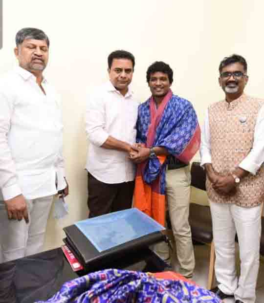భూదాన్పోచంపల్లి: దేశం గర్వించదగ్గ చేనేత కార్మికులు మన రాష్ట్రంలో ఉండటం ఆనందంగా ఉందని రాష్ట్ర ఐటీ చేనేత జౌళీ శాఖ మంత్రి కేటీ ఆర్ అన్నారు. భూదాన్పోచంపల్లికి చెందిన తడక రమేశ్, పోచంపల్లికి చెందిన యువ కళాకారులు సాయిని భరత్లు ప్రభుత్వ మెరిట్ సర్టిఫికెట్ అవార్డుకు ఎంపిక కాగా వారు రాష్ట్ర మంత్రి కేటీఆర్ను సోమవారం అసెంబ్లీలో ని ఆయన ఛాంబర్లో కలిశారు. ఈ సందర్భంగా కేటీఆర్ వారిని అభినందించారు. వారిని ఘనంగా సత్కరించారు.