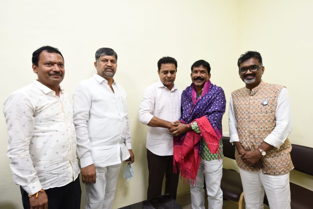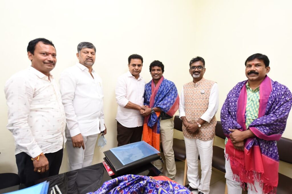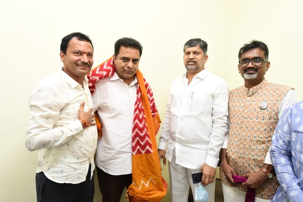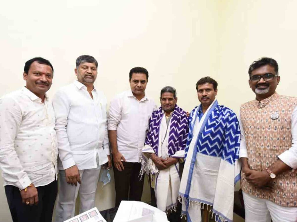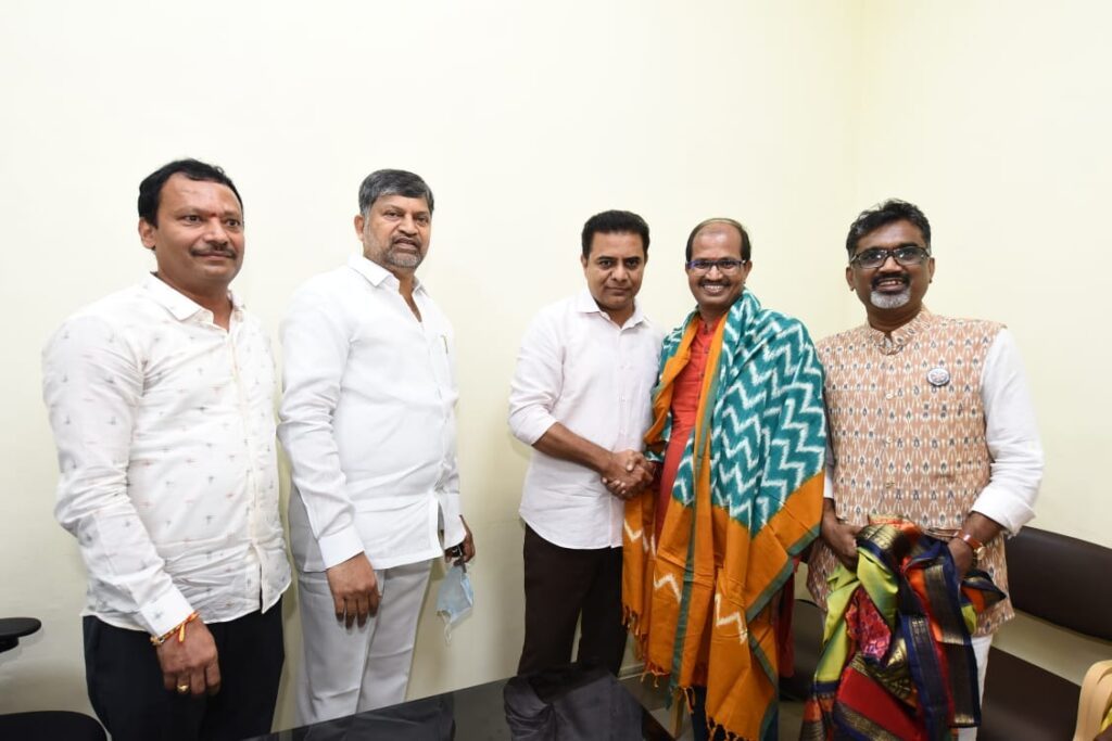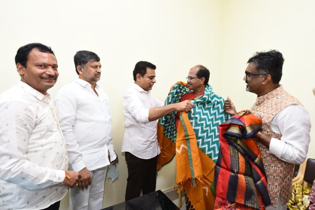హైదరాబాద్ : దేశం గర్వించదగ్గ చేనేత కళాకారులు తెలంగాణ రాష్ట్రం సొంతమని చేనేత శాఖ మంత్రి కేటీఆర్ అన్నారు. చేనేత రంగంలో విశిష్ట సేవలందించిన భారత ప్రభుత్వ జాతీయ అవార్డు గ్రహీతలు కొలను పెద్ద వెంకయ్య, కొలను రవీందర్, గజం భగవాన్, మెరిట్ సర్టిఫికెట్స్ విజేతలు సాయిని భారత్, దుద్యాల శంకర్, తడక రమేష్ను మంత్రి అసెంబ్లీలోని తన ఛాంబర్లో ఘనంగా సన్మానించారు.
