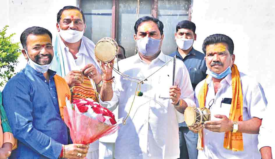 హైదరాబాద్, జనవరి 7 (నమస్తే తెలంగాణ): ఇటీవల కరోనా బారినపడి కోలుకొన్న మంత్రి ఎర్రబెల్లి దయాకర్రావును ఒగ్గు కళాకారులు ఆశీర్వదించారు. శుక్రవారం బంజారాహిల్స్లోని మంత్రుల నివాసంలో కలిసి.. ఎల్లమ్మ, మల్లన్నల పసుపు, కుంకుమ, ప్రసాదాలను మంత్రికి అందచేశారు. తమ సంప్రదాయ పద్ధతిలో ఢమరుకం మోగిస్తూ మంత్రిని ఆశీర్వదించారు. మంత్రిని కలిసిన వారిలో ఒగ్గు రవి నేతృత్వంలోని బృందం సభ్యులు ఉన్నారు. అనంతరం గొర్రెలు, మేకల అభివృద్ధి కార్పొరేషన్ చైర్మన్ దూదిమెట్ల బాలరాజు మర్యాదపూర్వంగా కలువగా మంత్రి అతన్ని అభినందించారు.