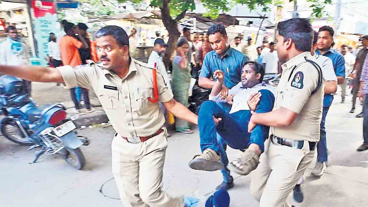 శాంతియుతంగా వెళ్తున్న నిరుద్యోగులపైకి వందలాది మంది పోలీసులు ఒక్కసారిగా లాఠీలతో విరుచుకుపడ్డారు. ఎక్కడికక్కడ కనిపించిన ప్రతివారినీ పోలీసు వ్యాన్లలో ఈడ్చిపడేశారు. పోలీసుల తీరుకు వ్యతిరేకంగా నినాదాలు చేయడంతో ఇరు వర్గాల మధ్య తోపులాట జరిగింది. ఇదే అదనుగా పోలీసులు లాఠీలకు పనిజెప్పారు. నిరుద్యోగులను నిలువరించేందుకు ఎక్కడికక్కడ లాఠీలతో ఇష్టారీతిన దాడులకు దిగారు. పోలీసుల దాడిలో పలువురు గాయాలపాలయ్యారు. పోలీసుల తీరును నిరసిస్తూ రోడ్డుపై బైఠాయించిన వారిని వ్యాన్లలో ఎక్కించి పోలీస్స్టేషన్కు తరలించారు. పిడిగుద్దులతో, దుర్భాషలాడుతూ పోలీసులు దౌర్జన్యానికి దిగారని నిరుద్యోగులు మండిపడ్డారు.