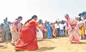 వరంగల్ జిల్లా నర్సంపేటలో మహిళా దినోత్సవాన్ని పురస్కరించుకొని శనివారం నిర్వహించిన కార్యక్రమంలో స్థానిక మహిళలతో కబడ్డీ ఆడుతున్న రాష్ట్ర స్త్రీ, శిశు సంక్షేమ, గిరిజనశాఖ మంత్రి సత్యవతి రాథోడ్, ఎంపీ మాలోత్ కవిత, జడ్పీ చైర్ పర్సన్ గండ్ర జ్యోతి