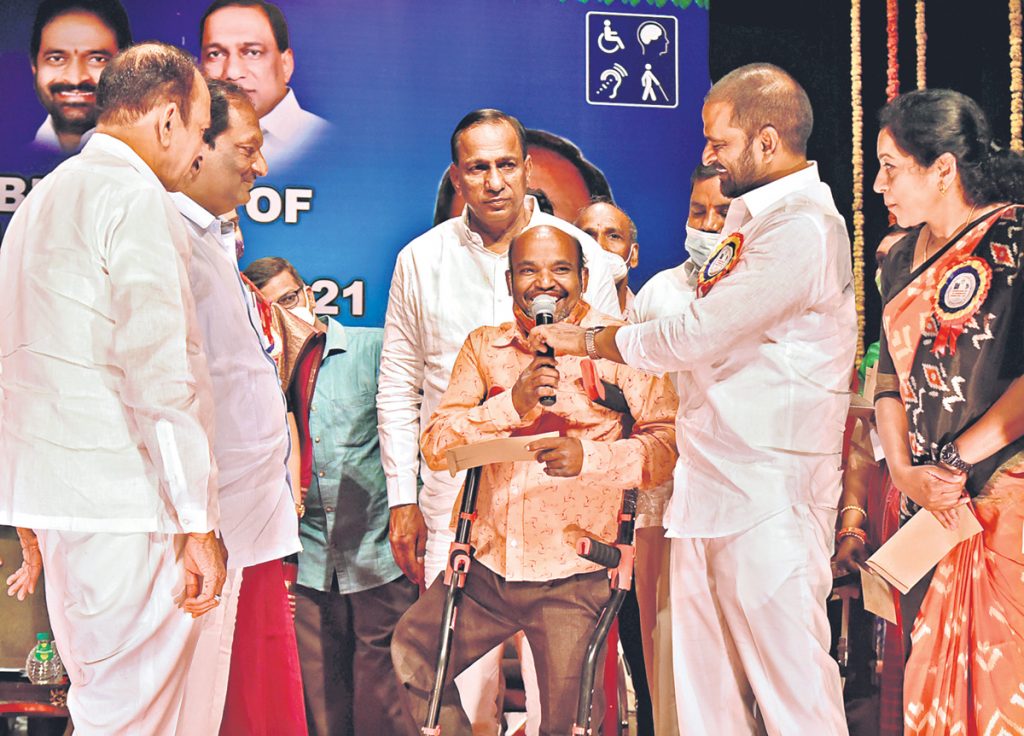 హైదరాబాద్ సిటీబ్యూరో, డిసెంబర్ 3 (నమస్తే తెలంగాణ)/ రవీంద్రభారతి: దివ్యాంగులు తలెత్తు కొని బతికేలా రూ.3,016 పింఛన్ ఇస్తున్నది కేవలం తెలంగాణ ప్రభుత్వమేనని ఎస్సీ, మైనారిటీ, దివ్యాంగుల సంక్షేమ శాఖ మంత్రి కొప్పుల ఈశ్వర్ అన్నారు. ప్రపంచ దివ్యాంగుల సంక్షేమ దినం సందర్భంగా శుక్రవారం రవీంద్రభారతిలో జరిగిన కార్యక్రమంలో మంత్రి ముఖ్యఅతిథిగా పాల్గొన్నారు. మొదట వికలాంగులు అనే పదాన్ని తొలగించి, దానిస్థానంలో దివ్యాంగులు అనే పదం చేర్చినట్లు తెలిపారు. రాష్ట ప్రభుత్వం వారిని కంటికి రెప్పలాగా చూసుకుంటుందని చెప్పారు. దివ్యాంగుల బాధ్యత, సంక్షేమం, అభ్యున్నతికి చిత్తశుద్ధితో కృషి చేస్తున్నామని స్పష్టం చేశారు. రూ.500 పింఛన్ నుంచి రూ.3,016కు పెంచామని గుర్తుచేశారు. రాష్ట్రంలో 5లక్షల మందికి పింఛన్లు ఇస్తున్నామన్నారు. అందుకోసం ఏటా 18 వందల కోట్లు ఖర్చు అవుతుందని చెప్పారు. దివ్యాంగులను ఇతరులు పెండ్లి చేసుకుంటే లక్ష రూపాయలు ప్రోత్సాహకం ఇస్తున్నామని వెల్లడించారు. ఉద్యోగాలలో 2 శాతం రిజర్వేషన్లు ఇస్తున్నామన్నారు. అభివృద్ధి, సంక్షేమ పథకాలలో రిజర్వేషన్లను 3 నుంచి 5 శాతం పెంచినట్టు తెలిపారు. డబుల్ బెడ్రూం ఇండ్లలో 5 శాతం కేటాయిస్తున్నట్టు పేర్కొన్నారు. రూ.21 కోట్లతో 14 వేల మందికి ఉపకరణాలు ఇస్తున్నామని చెప్పారు. దివ్యాంగులు ఆత్మ విశ్వాసంతో ముందుకు సాగాలన్నారు. ఈ సందర్భంగా వివిధ పాఠశాలలకు చెందిన దివ్యాంగులు సాంస్కృతిక ప్రదర్శనలు నిర్వహించారు. మంత్రులు దివ్యాంగులకు బ్యాటరీతో నడిచే మూడు చక్రాల సైకిల్తోపాటు ఇతర పరికరాలను అందజేశారు. ఈ కార్యక్రమంలో హోంమంత్రి మహమూద్ అలీ, పశుసంవర్థక శాఖ మంత్రి తలసాని శ్రీనివాస యాదవ్, పర్యాటక శాఖ మంత్రి శ్రీనివాసగౌడ్, కార్మిక శాఖ మంత్రి మల్లారెడ్డి, స్పెషల్ సెక్రటరీ దివ్య దేవరాజ్, డైరెక్టర్ శైలజ, ఇతర అధికారులు పాల్గొన్నారు.