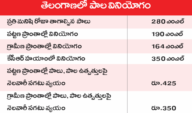 ప్రతి మనిషి రోజుకూ 280 మిల్లీలీటర్ల పాలు వినియోగించాలని ఇండియన్ కౌన్సిల్ ఆఫ్ మెడికల్ రీసెర్చ్ (ఐసీఎంఆర్) సంస్థ సిఫారసు చేసింది. కానీ, తాజా ప్రపంచ ఆరోగ్య సంస్థ నివేదక ప్రకారం.. రాష్ట్రంలోని పట్టణ ప్రాంతాల్లో 190 ఎంఎల్, గ్రామాల్లో 164 ఎంఎల్ మాత్రమే వినియోగిస్తున్నారు. మొత్తం సగటులో ఒక్కొక్కరు ఏడాదికి 54 లీటర్లు వినియోగిస్తున్నారు. ఇందులో 70% వినియోగం ఎగువ మధ్య తరగతి, సంపన్న వర్గాల్లోనే ఉన్నదని నివేదిక పేర్కొన్నది. కేసీఆర్ హయాంలో గ్రామీణ వ్యవస్థలు పునర్జీవం పోసుకొని పాడి పరిశ్రమ పెరిగినట్టు వ్యవసాయ శాఖ రికార్డులు చెప్తున్నాయి. నాడు ప్రతి వ్యక్తి రోజుకూ సగటున 350 ఎంఎల్ పాలు వినియోగించినట్టు పాడి పరిశ్రమల శాఖ నివేదికలు చెప్తున్నాయి.