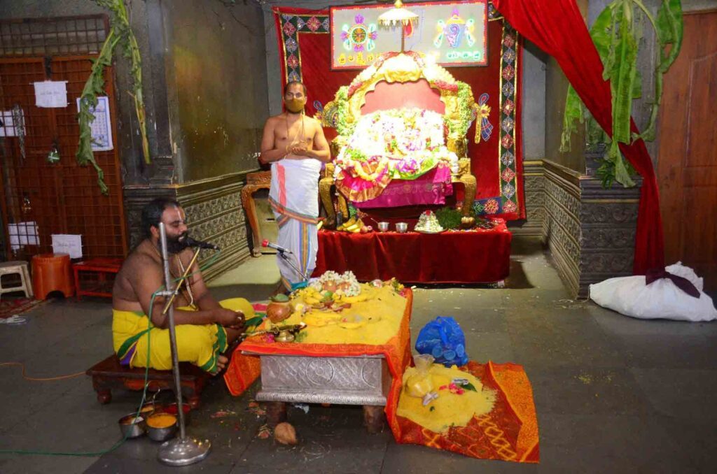 లక్ష్మీ సమేతుడైన నారసింహుడిని ఆరాధిస్తూ గంటన్నరకు పైగా కల్యాణ తంతును జరిపారు. బాలాలయ ముఖ మండ పంలో అష్టోత్తర పూజలు పెద్ద ఎత్తున జరిగాయి. సాయంత్రం అమ్మవారికి కుంకుమార్చన, అంజనేయ స్వామివారిని సహస్రనామార్చన చేశారు.