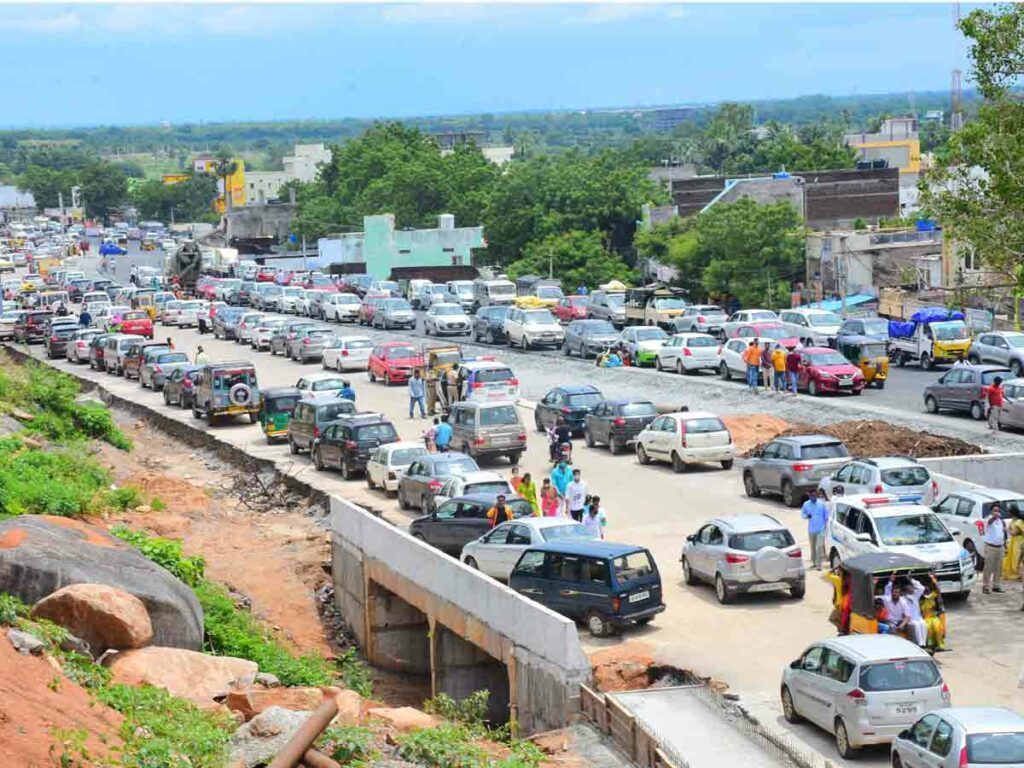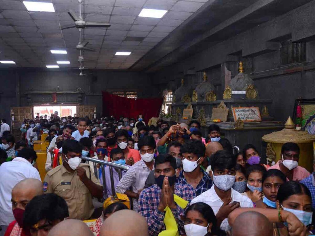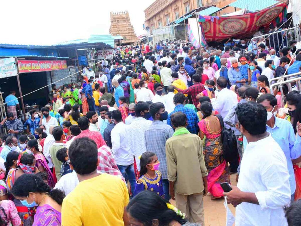 శ్రావణ మాసం ముగుస్తుండడం, సెలవుదినం కావడంతో ఆదివారం ఉదయం నుంచే భక్తుల తాకిడి మొదలైంది. భక్తుల రద్దీ దృష్ట్యా కొండపైకి ఎలాంటి వాహనా లను అనుమతించలేదు దీంతో భక్తులు కాలినడకన, ఆటోల్లో కొండపైకి చేరుకు న్నారు. ద్విచక్ర వాహనాలు రెండో ఘాట్ రోడ్డు మూలమలుపు వరకు పార్కింగ్ చేశారు. కొండకింద పార్కింగ్, టెంపుల్ సిటీ, ఘాట్ రోడ్డు, రింగురోడ్డు కార్లతో నిడిపోయింది.