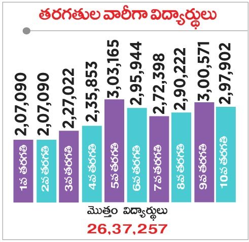 2020-21 విద్యాసంవత్సరానికి 26 వేల పైచిలుకు పాఠశాలల్లో 26,37,257 విద్యార్థులున్నట్టు గుర్తించారు. 1-10 తరగతుల్లో రాష్ట్రం మొత్తంలో 60 లక్షలమంది విద్యార్థులుండగా, 26 లక్షల మంది సర్కారు బడుల్లో చదువుకుంటున్నారు.