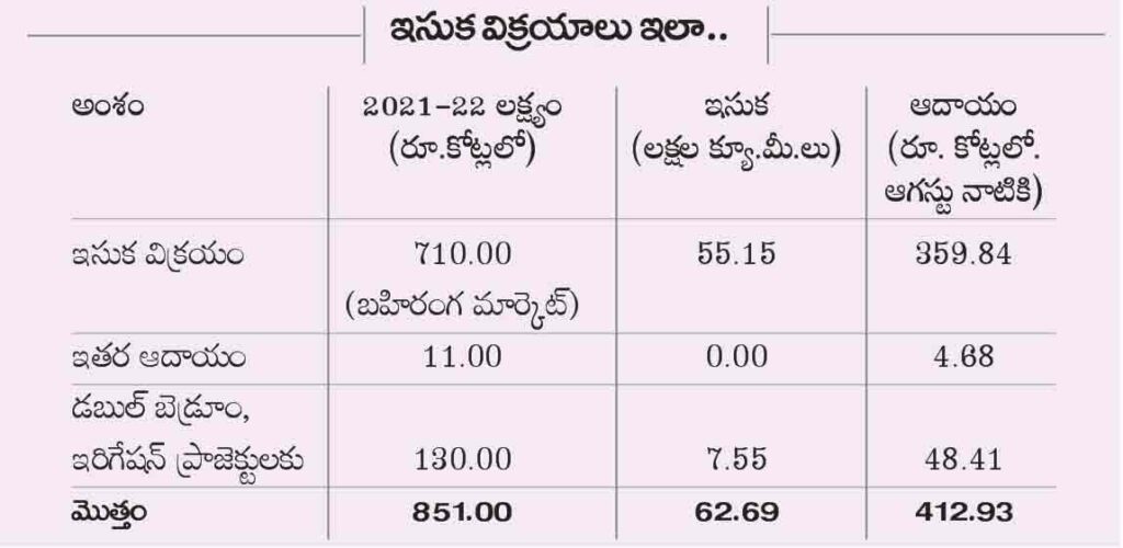 రాష్ట్ర ఖనిజాభివృద్ధి సంస్థ వెల్లడించిన వివరాల ప్రకారం 2021-22 ఆర్థిక సంవత్సరంలో ఇసుక విక్రయాల ద్వారా రూ. 851కోట్ల మేర ఆదాయం రాబట్టాలని ప్రభుత్వం లక్ష్యంగా పెట్టుకున్నది. ఆగస్టు నాటికి రూ.412.93 కోట్ల ఆదాయం సమకూరింది. 2020-21 ఆర్థిక సంవత్సరం ఆగస్టు నెలలో రూ. 21.54 కోట్ల ఆదాయం రాగా, ఈ ఏడాది ఆగస్టులో ఏకంగా రూ. 54.48 కోట్ల ఆదాయం వచ్చింది. దాదాపు 152.92 శాతం పెరుగుదల నమోదైంది. గతేడాది ఆగస్టు నాటికి రూ.305.28 కోట్ల ఆదాయం రాగా, ఈ ఏడాది ఆగస్టు చివరి వరకు రూ.412.93 కోట్లు వచ్చింది. ఇది గతేడాదికన్నా 35.26 శాతం అధికం. ఇసుక విక్రయాలు భారీగా పెరుగటంతో నిర్థేశిత లక్ష్యాన్ని సునాయాసంగా చేరుకొంటామని ఖనిజ వనరులశాఖ ఎండీ మల్సూరు తెలిపారు.