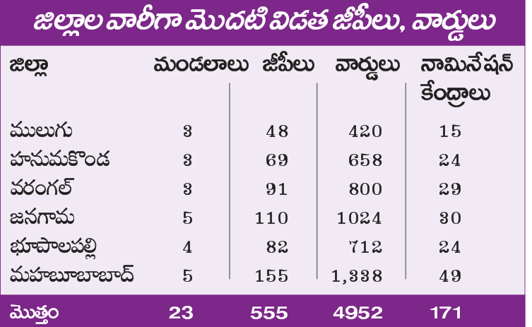 ఎన్నికల అధికారు లు ఈ నెల 29 వరకు ఉదయం 10 నుంచి సాయంత్రం 5 గంటల వరకు నామినేషన్లు స్వీకరించి 30న పరిశీలించనున్నారు. డిసెంబర్ 3న నామినేషన్ల ఉపసంహరణ పూర్తి కాగానే తుదిజాబితాను ప్రకటించి 11న ఉదయం 7 గంటల నుంచి మధ్యాహ్నం ఒంటి గంట వరకు పోలింగ్ నిర్వహించనున్నారు. 2 గంటల నుంచి ఓట్ల లెక్కింపు చేపట్టి తుది ఫలితాన్ని ప్రకటించనున్నారు. అనంతరం ఉపసర్పంచ్ ఎన్నిక జరుపనున్నారు. కాగా, మహబూబాబాద్ జిల్లాలో 49, హనుమకొండ 24, వరంగల్ 29, ములుగులో 15, జనగామలో 30, జయశంకర్ భూపాలపల్లిలో 24, మొత్తం 171 నామినేషన్ కేంద్రాలను సిద్ధం చేశారు.
