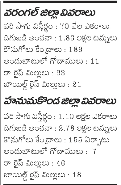 వడ్ల కొనుగోలులో రైస్ మిల్లర్లు, రైతులను ఎలాంటి ఇబ్బందులూ పెట్టొదని పరకాల ఎమ్మెల్యే చల్లా ధర్మారెడ్డి అన్నారు. కొనుగోలు కేంద్రం నుంచి రైస్ మిల్లుకు రైతులు సొంత ట్రాక్టర్లతో తెచ్చిన వడ్లను త్వరగా అన్లోడ్ చేయించాలన్నారు. వడ్లను కొనుగోలు చేసిన తర్వాత రైతులు వాటిని మిల్లుల వద్దకు తెచ్చే ప్రక్రియ వీలైనంత వేగంగా పూర్తయ్యేలా ఏర్పాట్లు చేయాలని వర్ధన్నపేట ఎమ్మెల్యే అరూరి రమేశ్ అన్నారు. శాఖల మధ్య సమన్వయంతో కలిసి పని చేయాలని నర్సంపేట ఎమ్మెల్యే పెద్ది సుదర్శన్రెడ్డి సూచించారు. రవాణా ఏర్పాట్లపై జాగ్రత్తలు తీసుకోవాలని అన్నారు. వడ్ల కొనుగోలు ప్రక్రియ వీలైనంత త్వరగా, వేగంగా పూర్తయ్యేలా చూడాలని భూపాలపల్లి, ఎమ్మెల్యే గండ్ర వెంకటరమణారెడ్డి సూచించారు. జిల్లా పరిషత్ చైర్మన్లు ఎం సుధీర్ కుమార్, గండ్ర జ్యోతి, డీసీసీబీ చైర్మన్ మార్నేని రవీందర్రావు పలు సూచనలు చేశారు. హనుమకొండ కలెక్టర్ రాజీవ్గాంధీ హన్మంతు, వరంగల్ కలెక్టర్ గోపి… రెండు జిల్లాల అడిషనల్ కలెక్టర్లు సంధ్యారాణి, హరిసింగ్, వివిధ శాఖల అధికారులు తదితరులు పాల్గొన్నారు.