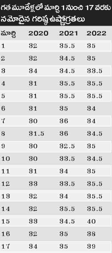 వరంగల్, మార్చి 17(నమస్తేతెలంగాణ) : జిల్లా లో ఉష్ణోగ్రతలు రోజురోజుకూ పెరిగిపోతున్నాయి. మునుపెన్నడూ లేని రీతిలో గరిష్ఠ ఉష్ణోగ్రతలు మార్చి మూడో వారంలోనే నమోదవుతుండడం ఆందోళన కలిగిస్తున్నది. ఉక్కపోతతో ప్రజలు ఉక్కిరిబిక్కిరి అవుతున్నారు. ఎండల తీవ్రత బాగా పెరగడంతో తీవ్ర ఇబ్బందులు పడుతున్నారు. పగలు బయటకు వెళ్లలేని పరిస్థితి నెలకొంటున్నది. గత మూడేళ్లలో మార్చి 1 నుంచి 17వ తేదీ వరకు పరిశీలిస్తే ఈ ఏడాది ఉష్ణోగ్రతలు రికార్డు స్థాయిలో పెరిగాయి. 2020 మార్చి 17వ తేదీ వరకు 34 డిగ్రీలు దాటలేదు. 2021లో 36 డిగ్రీలు నమోదైంది. ఈ ఏడాది నలభై డిగ్రీలకు చేరింది. గత మంగళవారం జిల్లాలో గరిష్ఠ ఉష్ణోగ్రతలు 40 డిగ్రీలు నమోదైనట్లు వరంగల్ ప్రాంతీయ వ్యవసాయ పరిశోధన కేంద్రం అధికారులు వెల్లడించారు. 2020, 2021, 2022 సంవత్సరం మార్చి లో నమోదైన ఉష్ణోగ్రతలను పరిశీలిస్తే 2020లో మార్చి 1 నుంచి 17వ తేదీ వరకు 30 నుంచి 34 డిగ్రీలు నమోదయ్యాయి. 3, 17 తేదీల్లో మాత్రమే 34 డిగ్రీలు నమోదైనట్లు అధికారులు తెలిపారు. 2021 మార్చిలో 32.5 నుంచి 36 డిగ్రీల ఉష్ణోగ్రతలు నమోదైనట్లు చెప్పారు. 7వ తేదీన 36 డిగ్రీలు నమోదైనట్లు ప్రకటించారు. ఈ ఏడాది ఇప్పటికే నలభైకి చేరడం ఆందోళన కలిగిస్తున్నది. 1 నుంచి 17వ తేదీ వరకు 33.5 నుంచి 40 డిగ్రీలు నమోదైంది. ఈ నెల 1, 2, 11 తేదీల్లో 35, 3న 33.5 డిగ్రీలు, 4, 5,12, 13, 14 తేదీల్లో 35.5 డిగ్రీలు, 6, 7 తేదీల్లో 34డిగ్రీలు, 8, 10 తేదీల్లో 34.5 డిగ్రీల ఉష్ణోగ్రతలు నమోదైతే 15న అత్యధికంగా 40 డిగ్రీలు నమోదైం ది. బుధవారం 38, గురువారం 39 డిగ్రీల ఉష్ణోగ్రతలు నమోదైనట్లు అధికారులు వెల్లడించారు. ఈ నెల లో 40 డిగ్రీల ఉష్ణోగ్రత నమోదైతే ఇదే మార్చి 15న 2020లో 33 డిగ్రీలు, 2021లో కూడా 33 డిగ్రీల ఉష్ణోగ్రత నమోదైంది. కాగా, ఈ ఏడాది మార్చి 15న అనూహ్య రీతిలో 40 డిగ్రీల ఉష్ణోగ్రత నమోదైంది.