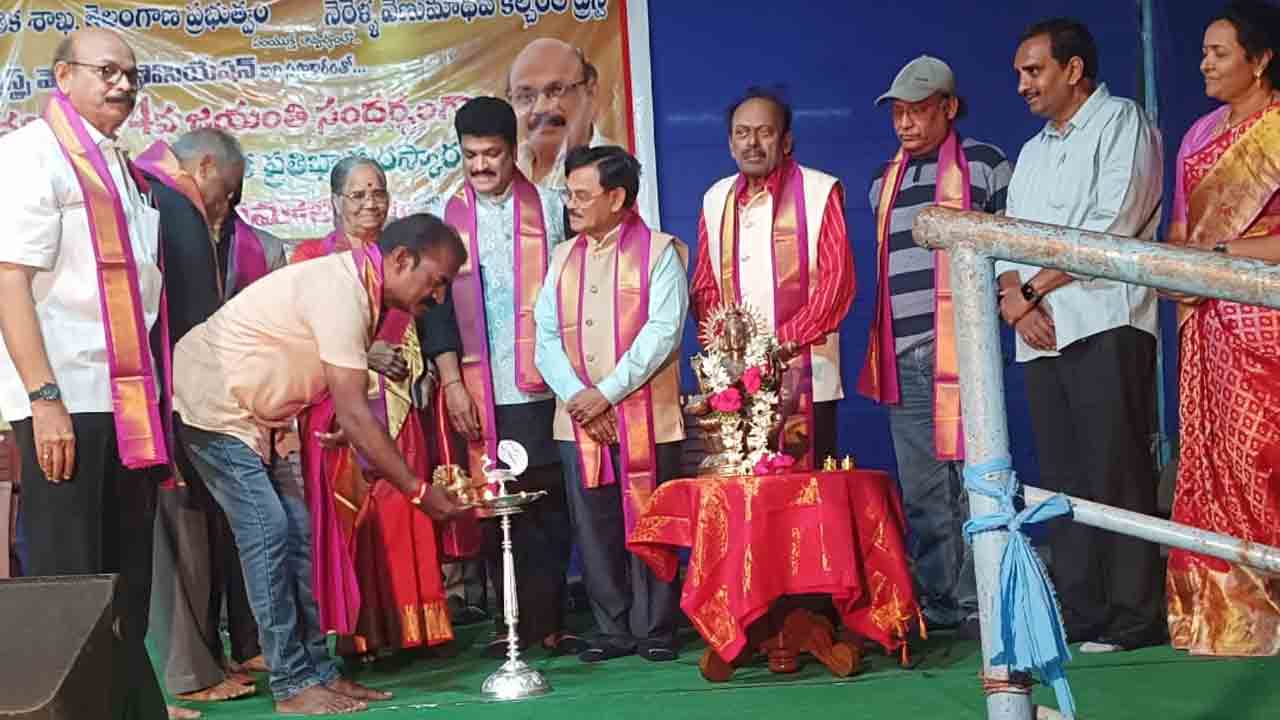 హనుమకొండ చౌరస్తా, డిసెంబర్ 28: తెలంగాణ రాష్ర్ట భాషా సాంస్కృతిక శాఖ సౌజన్యంతో మిమిక్రీ ఆర్టిస్ట్స్ వెల్ఫేర్ అసోసియేషన్ సహకారంతో డాక్టర్ నేరెళ్ల వేణు మాధవ్ (Nerella Venu Madhav) 94వ జయంతి, స్వరార్చన కార్యక్రమాన్ని ఘనంగా నిర్వహించారు. పబ్లిక్ గార్డెన్ నేరెళ్ల వేణుమాధవ్ కళాప్రాంగణంలోని ఆయన విగ్రహానికి పూలమాలవేసి నివాళులర్పించారు. ఈ సందర్భంగా ప్రసిద్ధ కవి, కథా రచయిత, నవలాకారులు, ఆంధ్రప్రదేశ్ ప్రభుత్వ స్వర్ణనంది పురస్కార గ్రహీత ప్రొఫెసర్ రామా చంద్రమౌళికి నేరెళ్ల వేణుమాధవ్ స్మారక ప్రతిభా పురస్కారాన్ని అందజేశారు.