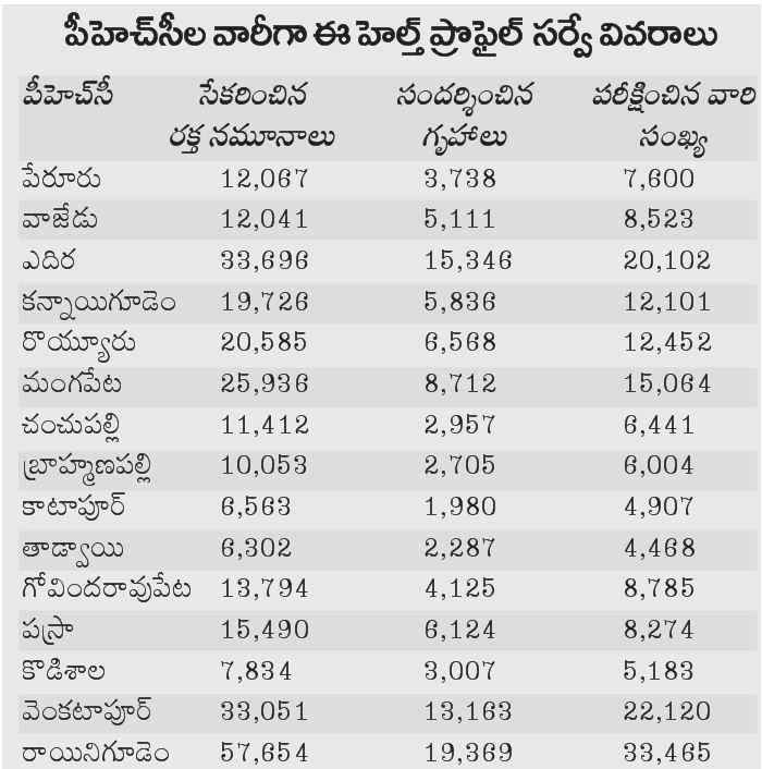 18 ఏళ్లు దాటిన 1,81,655 మందికి వైద్య పరీక్షలు నిర్వహించారు. ప్రజల నుంచి సేకరించిన రక్తనమూనాలను అధునాతన టీ డయాగ్నస్టిక్ సెంటర్లో పరీక్షించి 1,21,336 మందికి రిపోర్టులను పంపిణీ చేశారు. మిగతా వారికి సైతం అందించనున్నారు. ఈ సర్వే మార్చి 5వ తేదీన రాష్ట్ర వైద్య ఆరోగ్య శాఖ మంత్రి తన్నీరు హరీశ్రావు చేతులమీదుగా ప్రారంభమై మే 31వ తేదీ వరకు కొనసాగి 92శాతం పూర్తయ్యింది. మిగతా ఎనిమిది శాతం మంది బతుకుదెరువు కోసం ఇతర ప్రాంతాల్లో నివసిస్తున్నవారు. వారి ఆరోగ్య వివరాలను వైద్య సిబ్బంది చేపట్టలేకపోయారు. వారు వచ్చినప్పుడు పీహెచ్సీలను సందర్శిస్తే వివరాలను సేకరించి రిపోర్టులు అందించేందు కు ఏర్పాట్లు చేశారు.