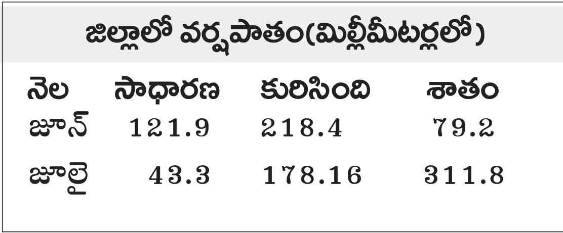 ఎడతెరిపిలేని వర్షాలతో చెరువులు, కుంటల్లోకి నీరు చేరతున్నది. జిల్లాలో వారం రోజుల నుంచి మోస్తరు వర్షాలు కురుస్తున్నాయి. బుధవారం సైతం ముసురు పడడంతో నర్మెటలో అత్యధికంగా 38.4 మి.మీ, కొడకండ్లలో అత్యల్పంగా 14.6 మి.మీ నమోదైంది. జే చొక్కారావు(దేవాదుల) ఎత్తిపోతల పథకంలో భాగంగా నిర్మించిన స్టేషన్ఘన్పూర్, చీటకోడూరు, అశ్వరావుపేట, గండిరామారం, బొమ్మకూరు, నవాబుపేట రిజర్వాయర్లలోకి వరద వస్తున్నది. వాతావరణం ఆశాజనకంగా ఉండడంతో వరి నాట్లు వేసేందుకు రైతులు సిద్ధమవుతున్నారు. మెట్ట పంటలైన పత్తి, పెసర, వేరుశనగకు ఢోకా లేకపోవడంతో ఆనందం వ్యక్తం చేస్తున్నారు.